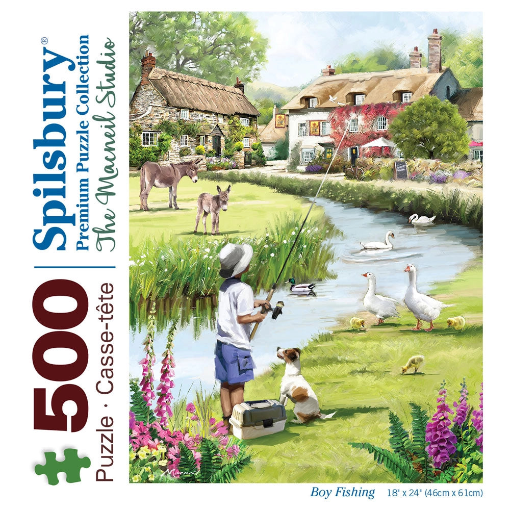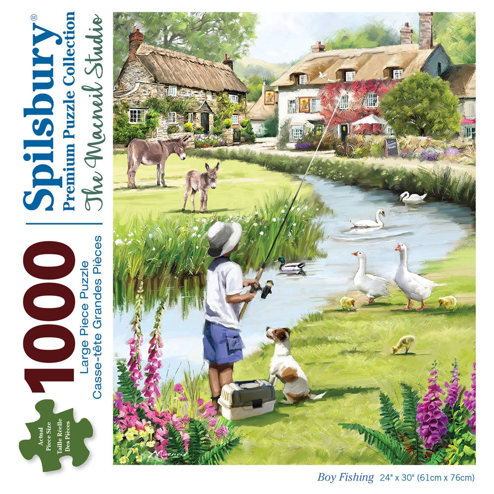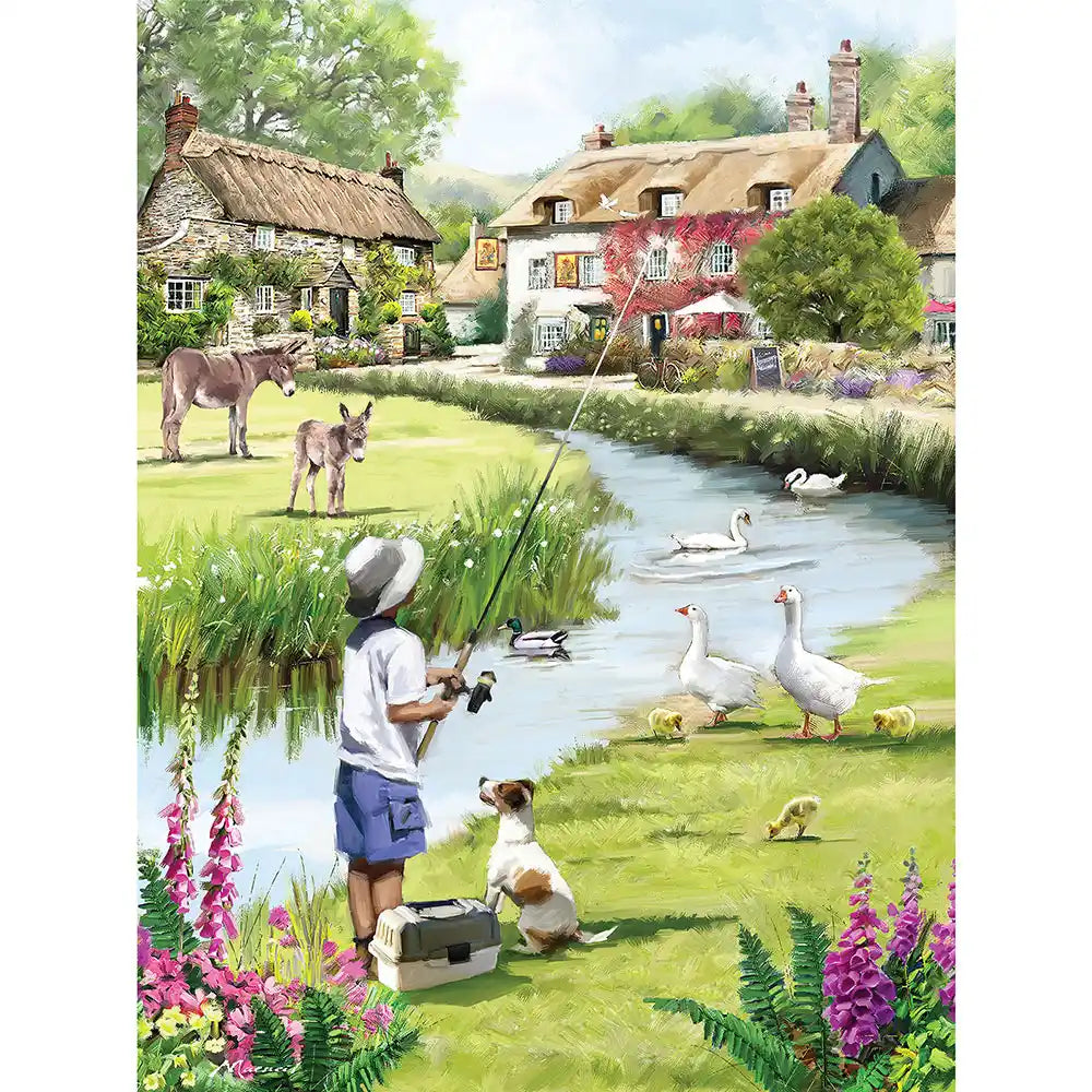 Step into the tranquility of the countryside with Boy Fishing by The Macneil Studio. This charming jigsaw puzzle captures a picturesque day by the river, where a young boy, his loyal pup, and curious geese enjoy the peaceful scene. Quaint cottages, colorful flowers, and playful donkeys complete this idyllic portrait of rural life. Perfect for those who cherish simpler moments.