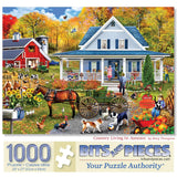 Experience the charm of rural life with Country Living in Autumn, a delightful jigsaw puzzle by Mary Thompson. A cozy farmhouse with a sprawling porch is surrounded by colorful fall foliage, a bustling barnyard, and a horse-drawn wagon. Friendly farm animals, from dogs to chickens, add to the lively scene, making this puzzle a celebration of the peaceful joys of autumn on the farm.