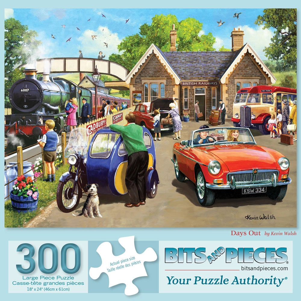 Step back in time with "Days Out," a nostalgic puzzle designed by Kevin Walsh. This vibrant artwork depicts a lively British railway station scene, complete with vintage cars, steam trains, and cheerful families enjoying a sunny outing. The detailed characters and classic vehicles evoke the charm of yesteryear, bringing a sense of warmth and nostalgia to this delightful design. Perfect for fans of retro art and train enthusiasts, this puzzle captures the joy of a classic countryside excursion. Add a touch of timeless charm to your collection with this captivating piece.