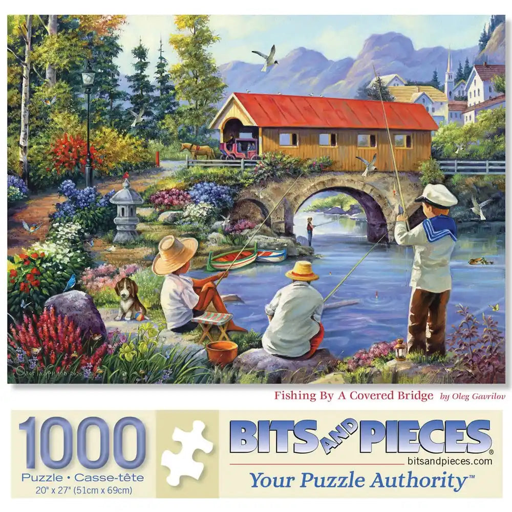 Fishing By A Covered Bridge by Oleg Gavrilov captures the charm of a peaceful day spent by the river. Children cast their lines beneath a classic wooden bridge surrounded by blooming gardens, friendly animals, and a quiet village beyond. This beautifully illustrated jigsaw puzzle is available in both 300- and 1,000-piece counts and offers a relaxing, nostalgic escape for any puzzler.