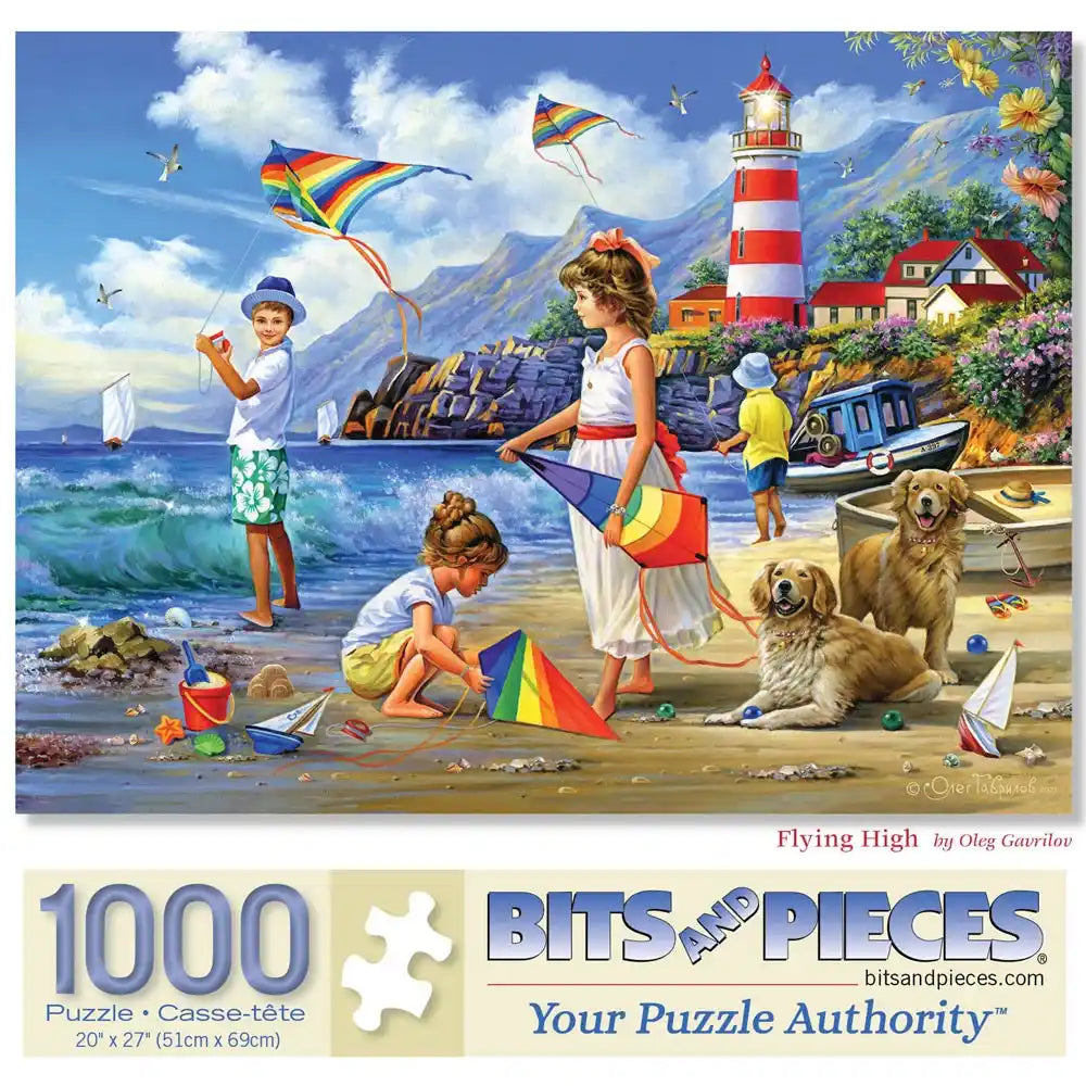 Flying High by Oleg Gavrilov captures a cheerful seaside scene where children fly colorful kites along a breezy shoreline. With a red-striped lighthouse, boats bobbing in the bay, playful dogs, and vibrant summer outfits, this puzzle is bursting with joyful energy and coastal charm. Available in both 300- and 500-piece counts, it's a delightful choice for anyone who loves the beach, family fun, and bright, nostalgic illustrations.