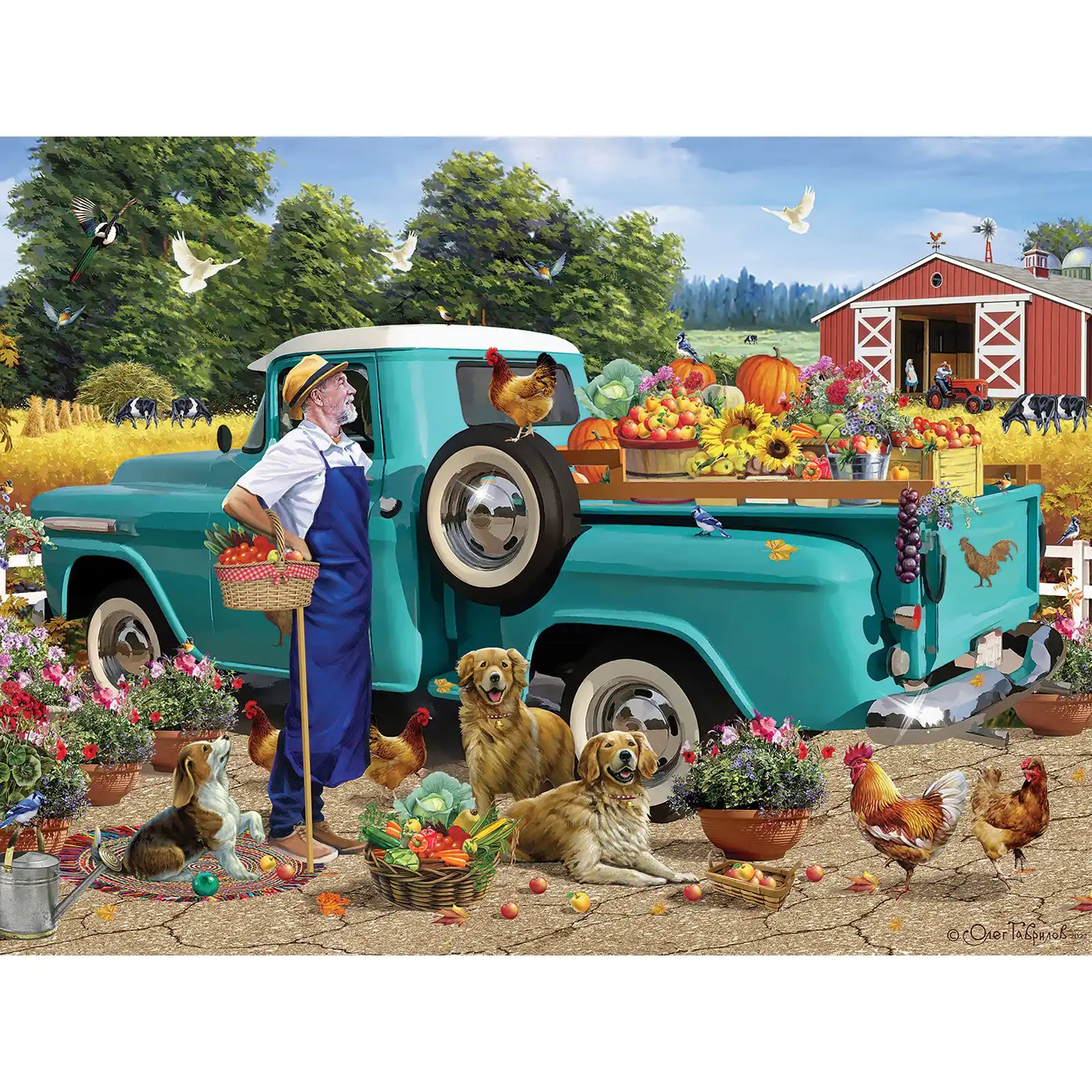 Oleg Gavrilov's delightful puzzle captures a bustling farmyard scene centered around a vibrant turquoise truck loaded with fresh produce, pumpkins, and sunflowers. Surrounding the truck are playful dogs, chickens, and colorful flowers, creating a lively atmosphere filled with the charm of rural life. In the background, a picturesque red barn and golden fields complete the idyllic farm setting. This puzzle is a celebration of nature's bounty and the joy of country living, perfect for puzzle enthusiasts who love farm-inspired designs.