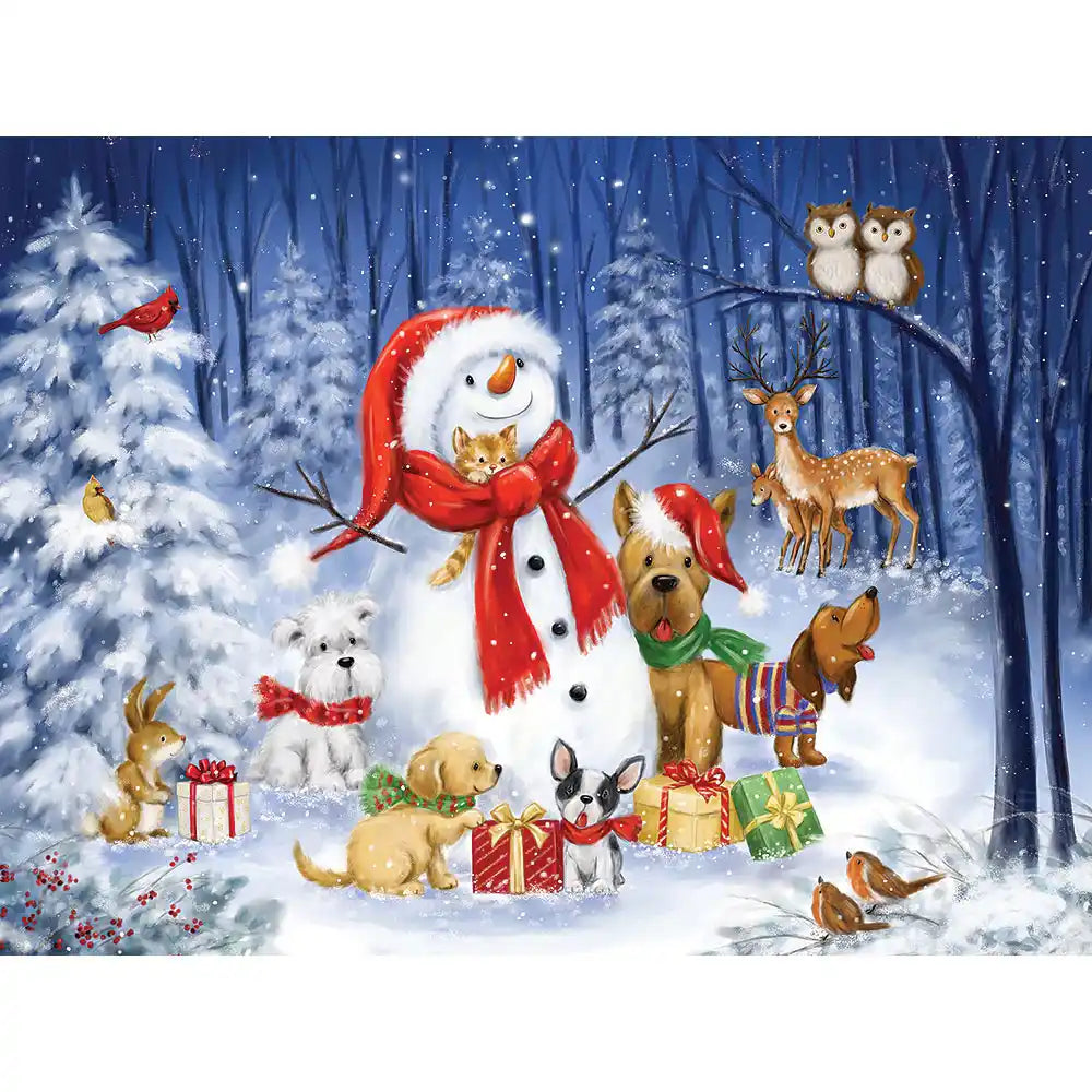 This jigsaw puzzle is designed by Makiko. Puzzles are generally less challenging and can often be completed in just one day. Amidst the snow-covered forest, the snowman warmly welcomes his dog friends, including a playful Boxer, with open arms, as they exchange gifts to celebrate the Christmas season. Two wise owls perch on a tree, while a curious deer watches from a distance, creating a heartwarming and festive winter scene. Available in multiple piece counts.